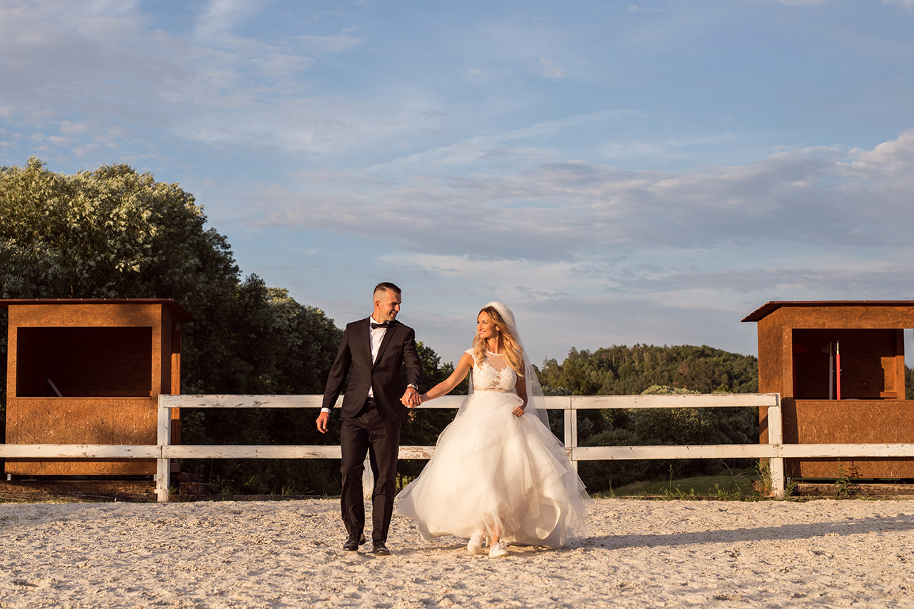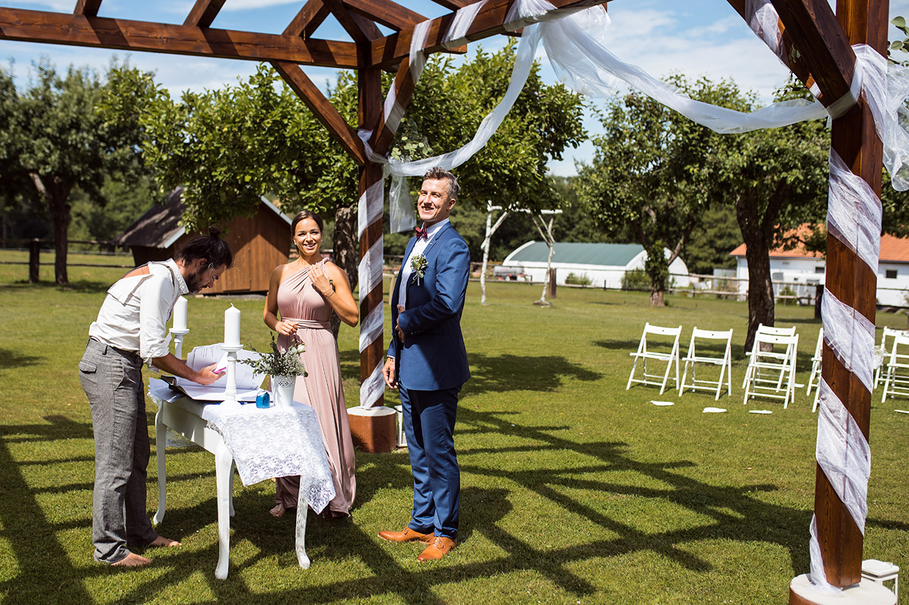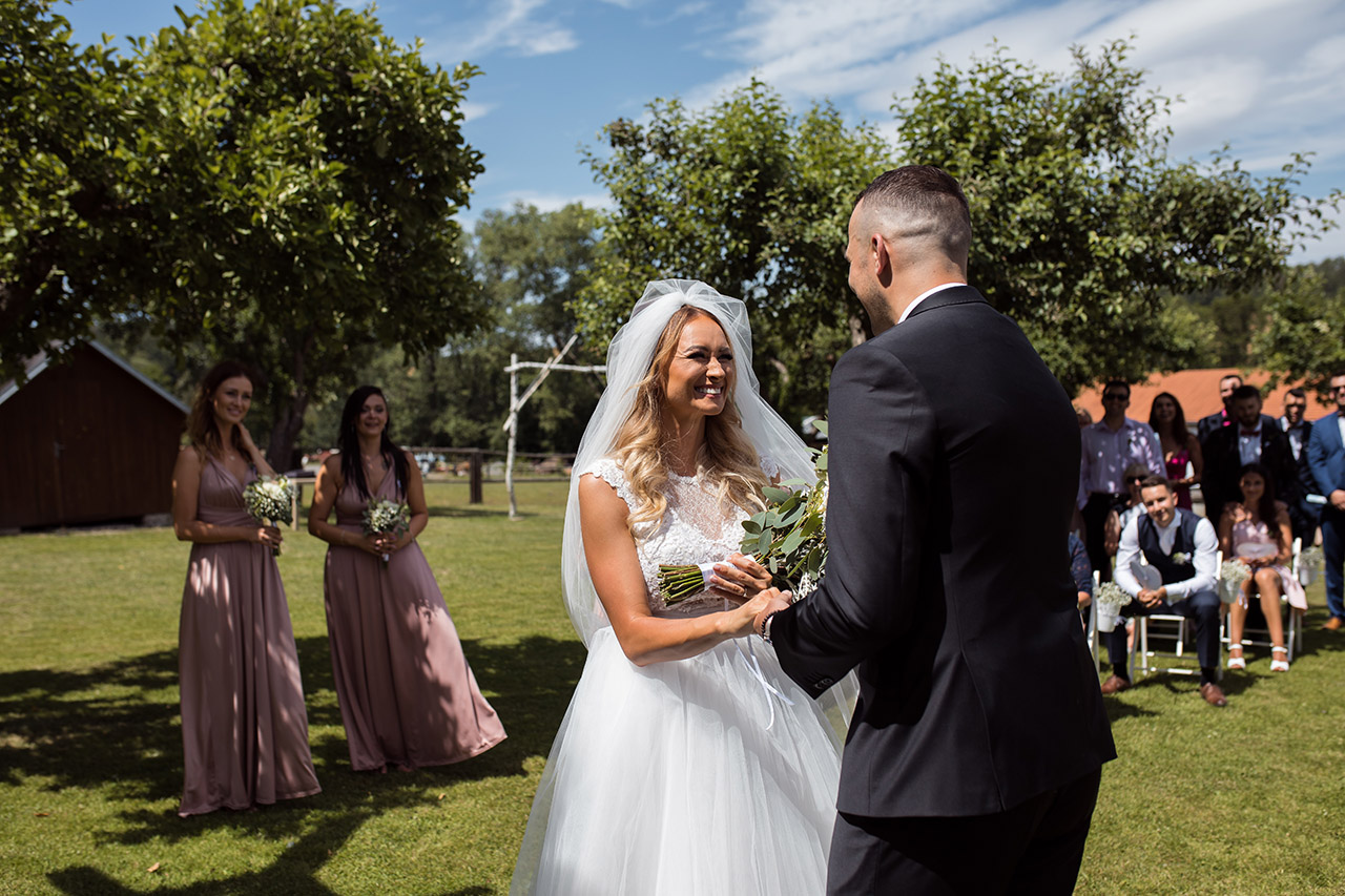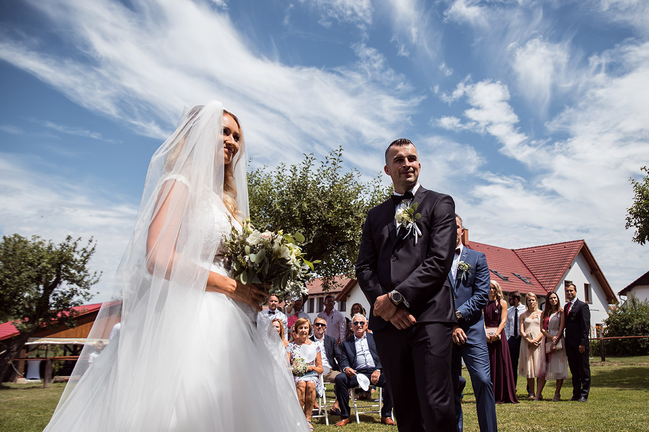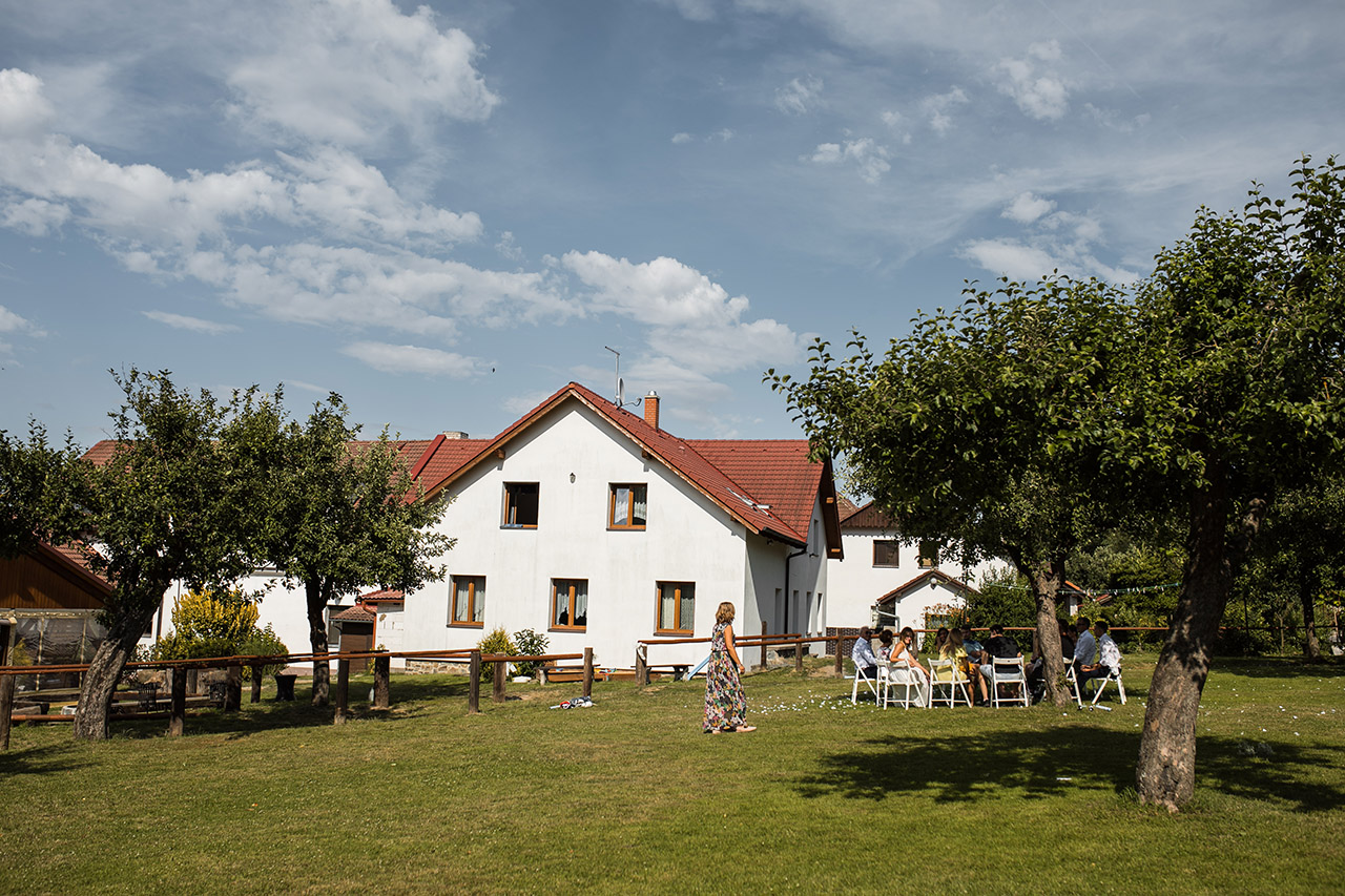 Farmu Heroutice kousek za Prahou si pro svůj svatební den vybrali Adélka s Matějem a troufnu si říci, že na jejich veselici nikdo jen tak nezapomene. Jejich nádherný venkovní obřad vyzdobily na obloze i samotné mraky, jejich dojemné a láskyplné svatební sliby nám daly všem opravdu „zabrat“, jejich famózní a bezpochyby ten nejoriginálnější svatební tanec, co jsem kdy viděla, naprosto ohromil všechny hosty, jejich svatba byla jednoduše nádhernou ukázkou toho, jak všechno v životě může úžasně fungovat, když máte kolem sebe skvělé přátele a rodinu, když je vše tvořeno s láskou a pokorou, když mají lidé srdce na pravém místě a když se k tomu všemu přidá nějaké to požehnání ze shora 🙂 Přeji Vám hodně štěstí, upřímné lásky a nikdy nezapomeňte na ty krásné sliby, co jste si dali. Ještě teď mi zní v uších – byla to nádhera!